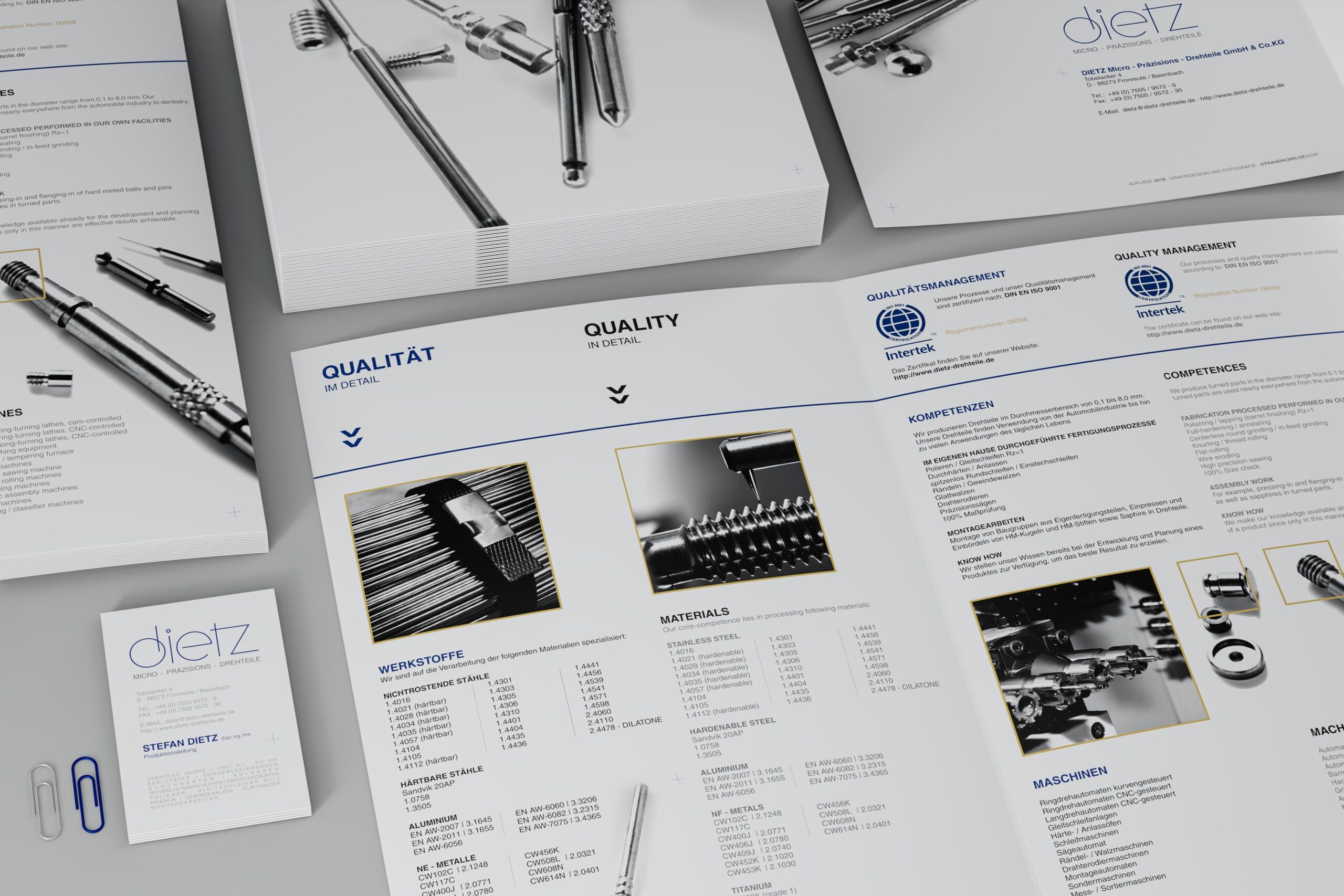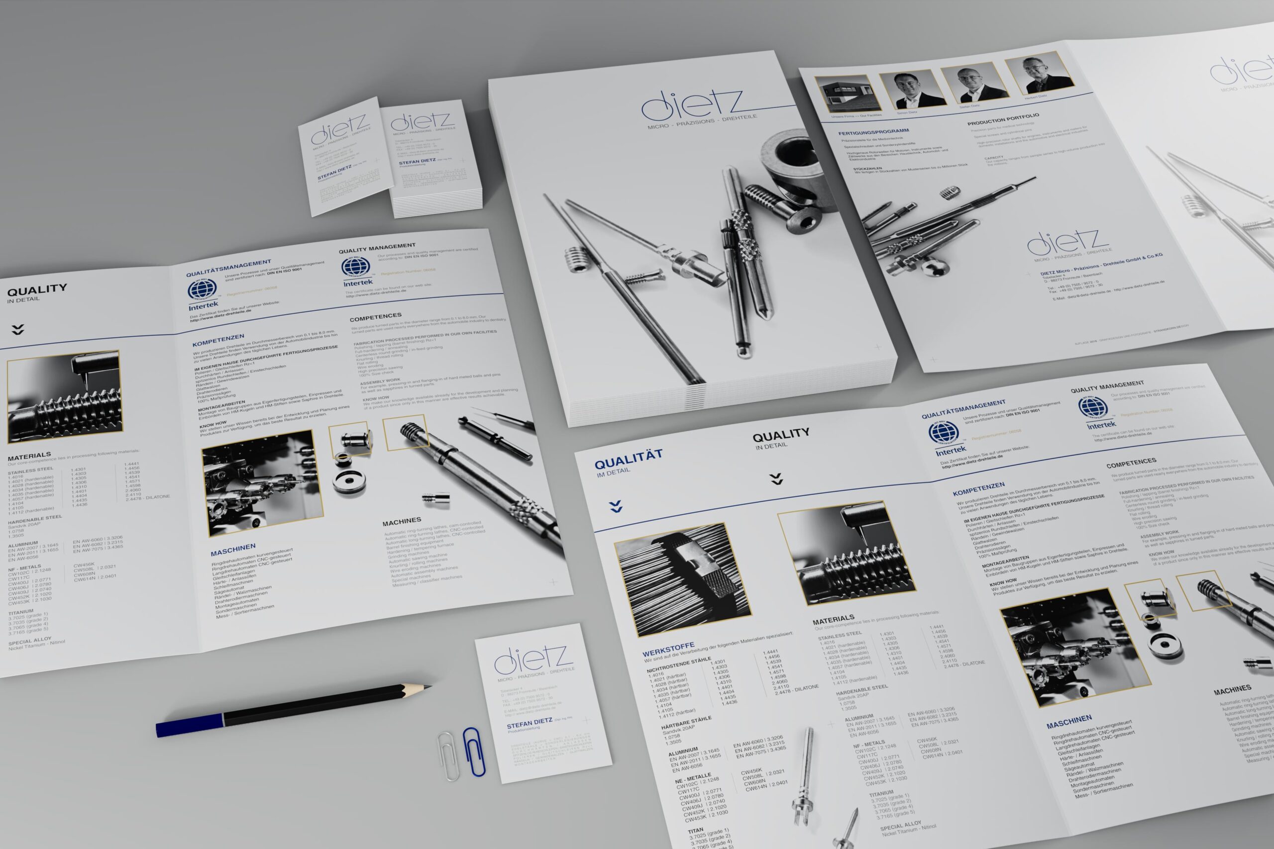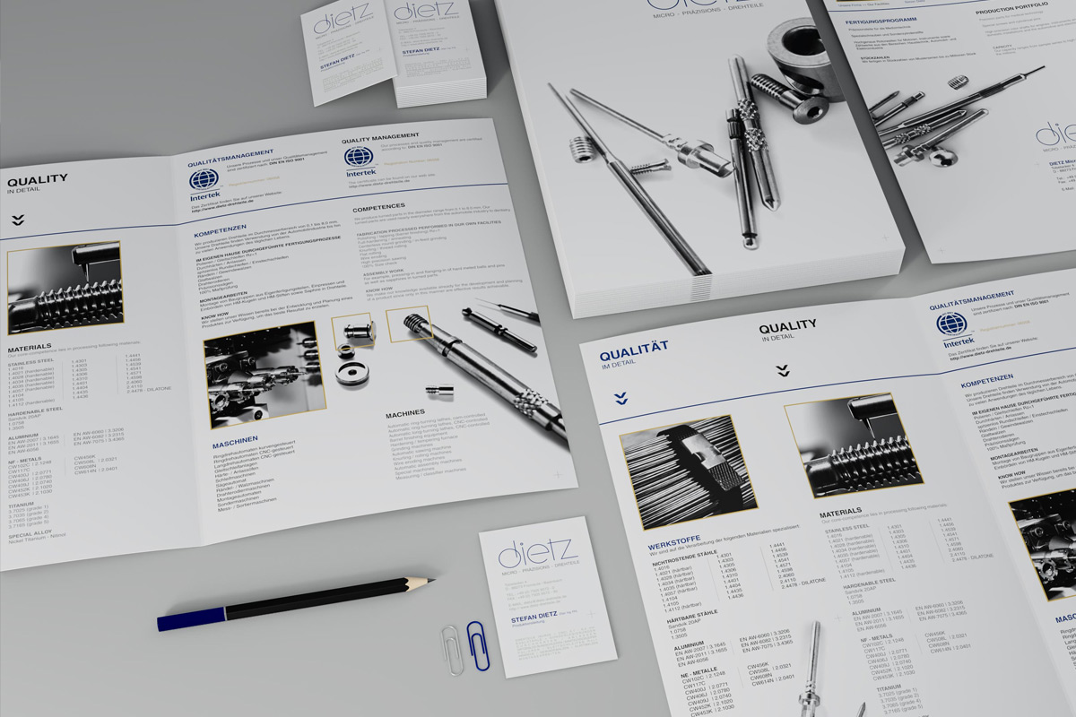 Für die Firma DIETZ Micro-Präzisions-Drehteile GmbH & Co.KG wurde das bestehende Logo überarbeitet und ein klares Corporate Design entwickelt. Es wurden Schriften und Farben festgelegt, sämtliche Geschäftsdrucksachen wie Briefhüllen und Visitenkarten erstellt und Werbematerialien, Prospekte und Postkarten angefertigt.