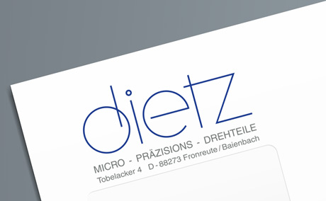 Für die Firma DIETZ Micro-Präzisions-Drehteile GmbH & Co.KG wurde das bestehende Logo überarbeitet und ein klares Corporate Design entwickelt. Es wurden Schriften und Farben festgelegt, sämtliche Geschäftsdrucksachen wie Briefhüllen und Visitenkarten erstellt und Werbematerialien, Prospekte und Postkarten angefertigt.